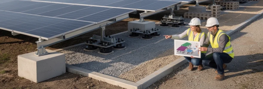 L’avantage principal des blocs préfabriqués réside dans leur disponibilité immédiate et leur coût maîtrisé. Les dimensions standards permettent un calcul précis du poids nécessaire, évitant ainsi le surdimensionnement coûteux. La durabilité de ces éléments béton garantit une solution pérenne pour votre installation solaire. Cependant, leur manipulation peut s’avérer délicate en raison de leur poids unitaire important, nécessitant parfois l’intervention d’équipements de levage pour les installations de grande envergure.